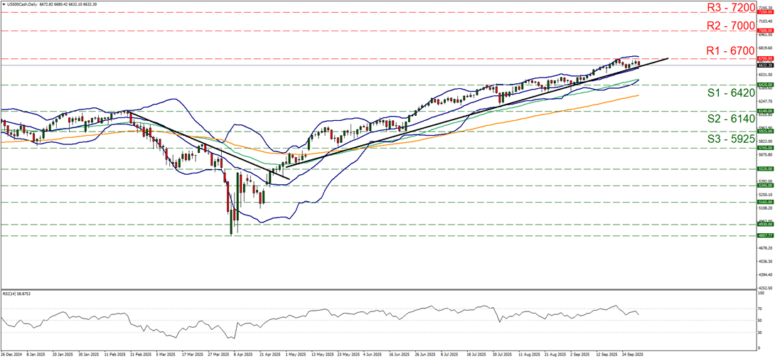 Since our last report, S&P 500 seems to have stabilised just below the 6700 (R1) resistance line. Yet the upward trendline guiding the index since the start of May remains intact supporting the bullish outlook for S&P 500. Also the Bollinger band channel maintains an upward direction, as do the 50 (Green line) and 100 (Orange line) moving averages, all further supporting index’s bullish outlook. The RSI indicator however, edged lower nearing the reading of 50, implying an easing of the market’s bullish sentiment for the index and following also the drop of index’s price action today. Also the failure of the index’s price action form a new higher peak after the 23rd of September tends to enhance suspicions for a possible stabilisation of the index’s price action. For the time being we maintain our bullish outlook for the index and intend to keep it as long as the prementioned upward trendline continues to guide the index, yet also issue a warning for a possible stabilisation of the index’s price action. Should the bulls remain in charge as expected, we may see S&P 500’s price action breaking the 6700 (R1) resistance line which marks an All Time High level for the index and set as the next possible target for the bulls the 7000 (R2) resistance barrier. Should the index stabilise, we may see its price action failing to break the R1, thus it would have to break the prementioned upward trendline in a first signal of an interruption of the index’s upward movement and remain within the corridor formed by the S1 and the R1. A bearish outlook currently seems remote and for its adoption we would require the index not only to break the prementioned upward trendline but to also break the 6420 (S1) support line and start aiming for the 6140 (S2) support level.