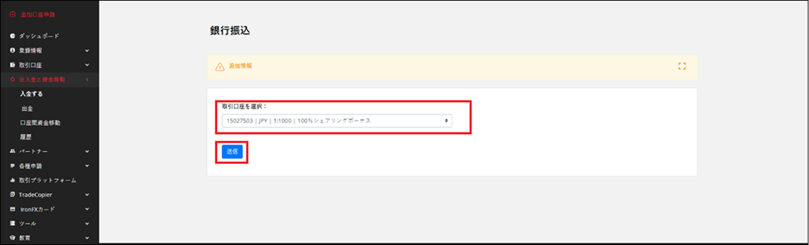2,反映先の取引口座を選択し、送信をクリックしてください。