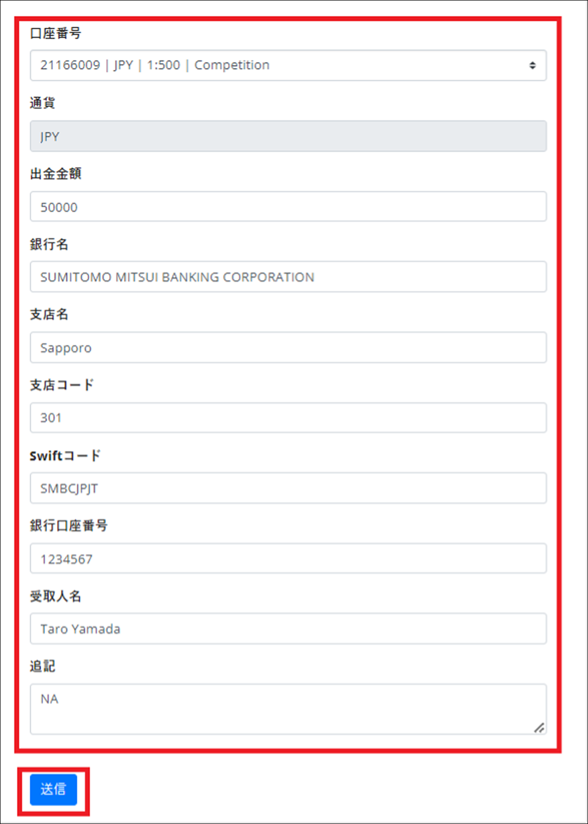 2,出金先のお客様の銀行口座をご入力いただくフォームが表示されますので、下記に従いご入力いただき、「送信」をクリックしてください。