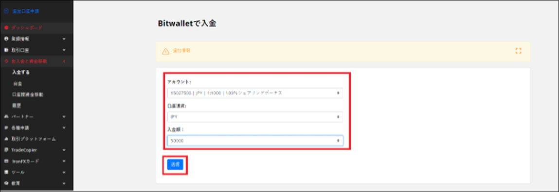2,反映先の取引口座、入金する通貨、入金額を選択して、送信をクリックしてください。