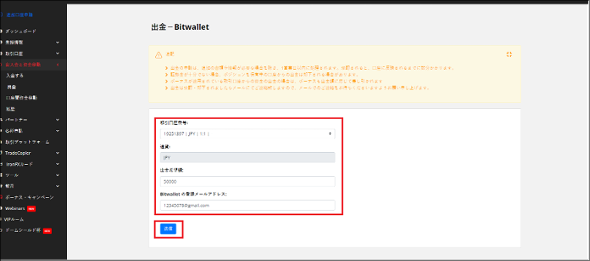 2,出金申請フォームが表示されるので、下記に従い入力して、「送信」をクリックしてください。