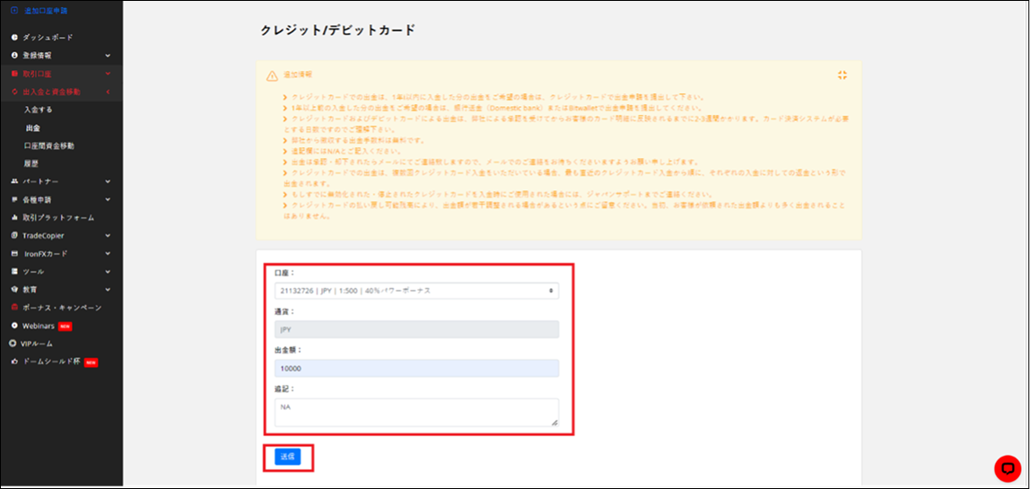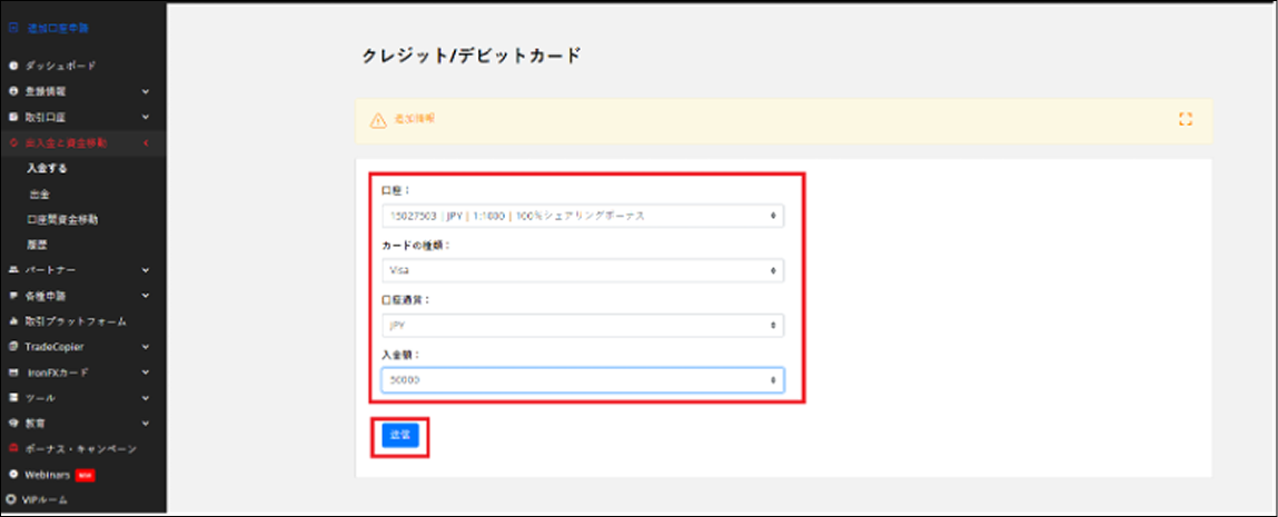 2,入金先を反映する先の口座、カードの種類、入金する通貨、入金額を選択後「送信」ボタンをクリックします。