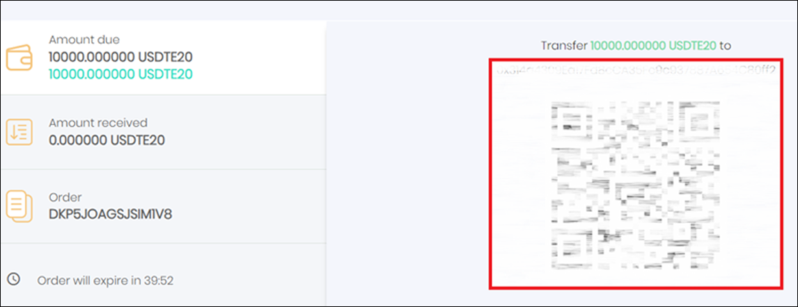 3,そうしますと、下記の画面に移動しますので、お客様の暗号通貨ウォレットから赤で囲った送金先に暗号通貨をお送りください。一番安全な方法は、出金元のプラットフォームにて、「表示されているQRコードを読み取ってアドレスを入力すること」です。またはアドレスをコピー&ペーストして、出金元のプラットフォームの画面にアドレスを入力してください。送金先画面は40分経つと切れてしまうため、40分以内に作業をお願いします。間違えて入力した場合は、入金されず、戻ってこない可能性がありますので細心の注意を払って操作ください。