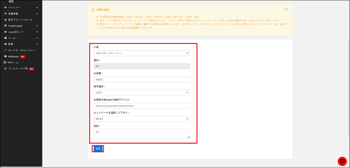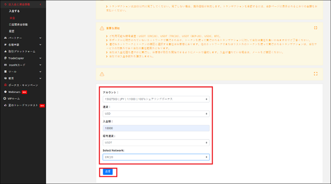 2,反映先の取引口座、通貨(USDのみ選択可能です)、入金額(金額の単位はUSDです。反映先の取引口座でJPYの口座を選んだ場合は、アカウントへの入金額は、日本円になります。こちらは日々の弊社のドル円参照レートに応じて算出されます。)、暗号通貨の種類、USDTの場合はネットワークも選択して、送信をクリックしてください。