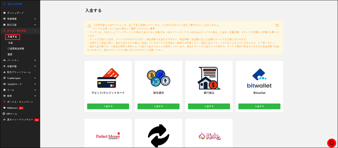 IronFXで登録されている名義と同一名義でのみ入金・出金が可能です。