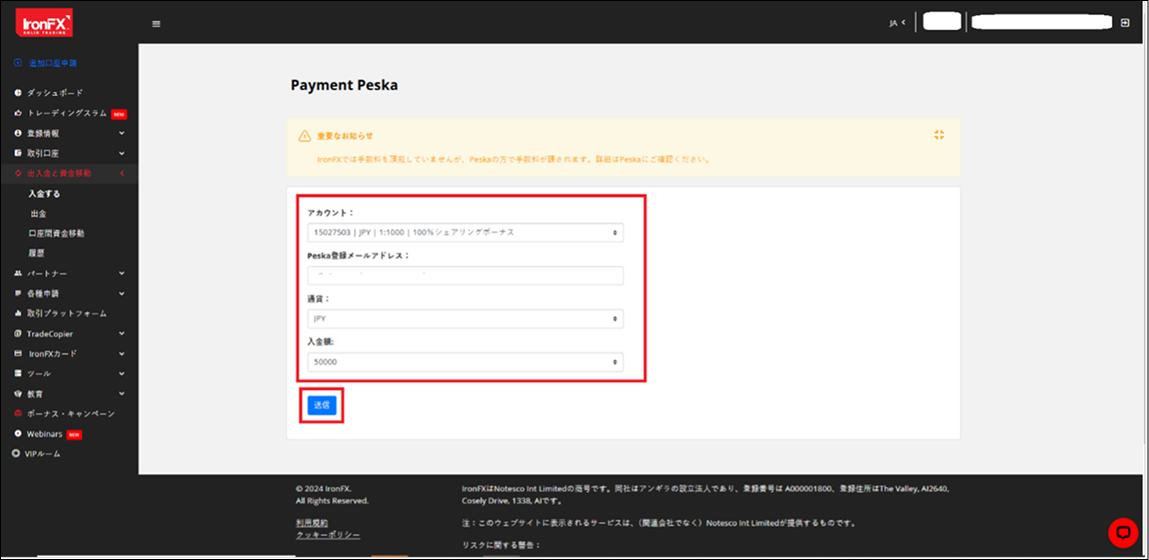 2,反映先の取引口座、Peskaの登録メールアドレス、入金する通貨、入金額を選択して、送信をクリックしてください。