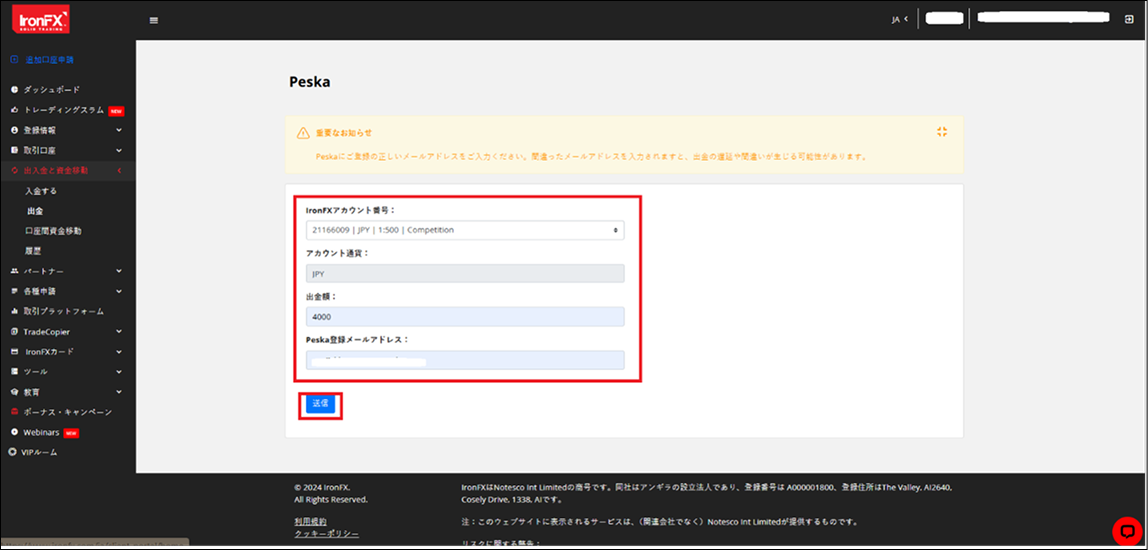 Peska登録メールアドレス:Peskaにご登録のメールアドレスをご入力ください。Peskaの登録EメールアドレスとIronFXの登録Eメールアドレスが相違している場合、認証が必要のため、Peskaの登録画面のスクリーンショット(登録名と登録メールアドレスが確認できる画像をお送りください)をジャパンサポートにご送付ください。スクリーンショットを送付頂くまで出金申請は保留となりますのでご注意ください。