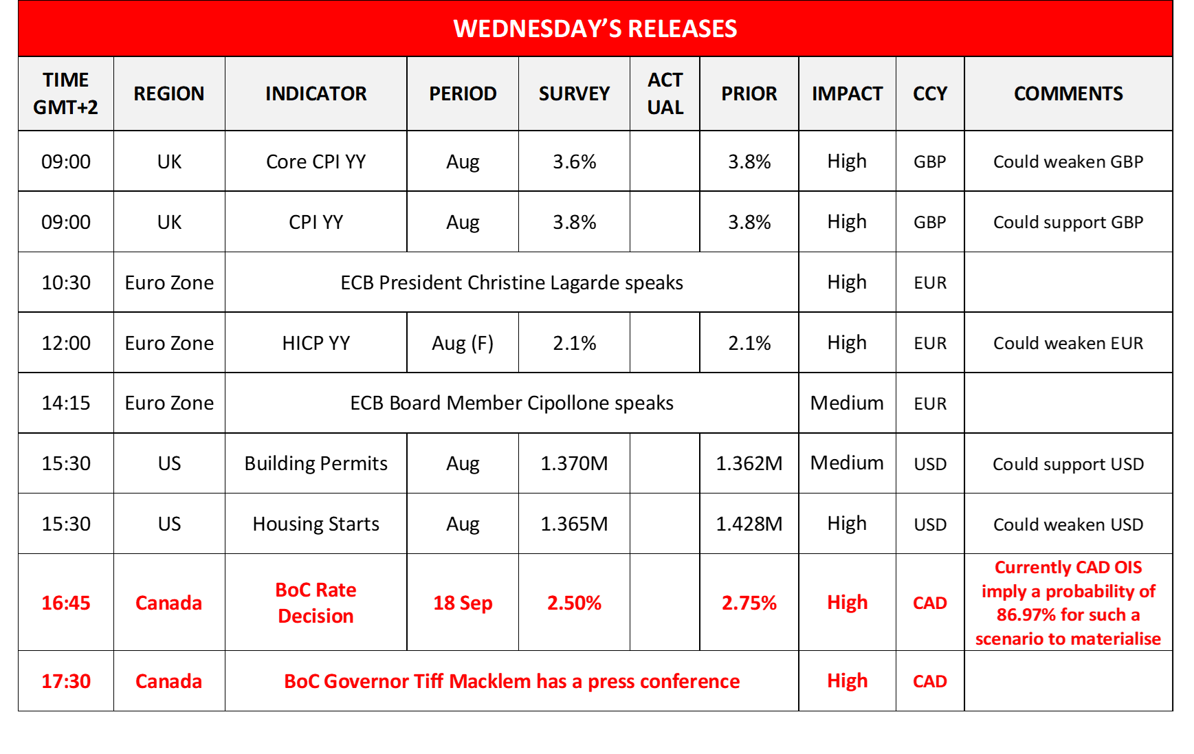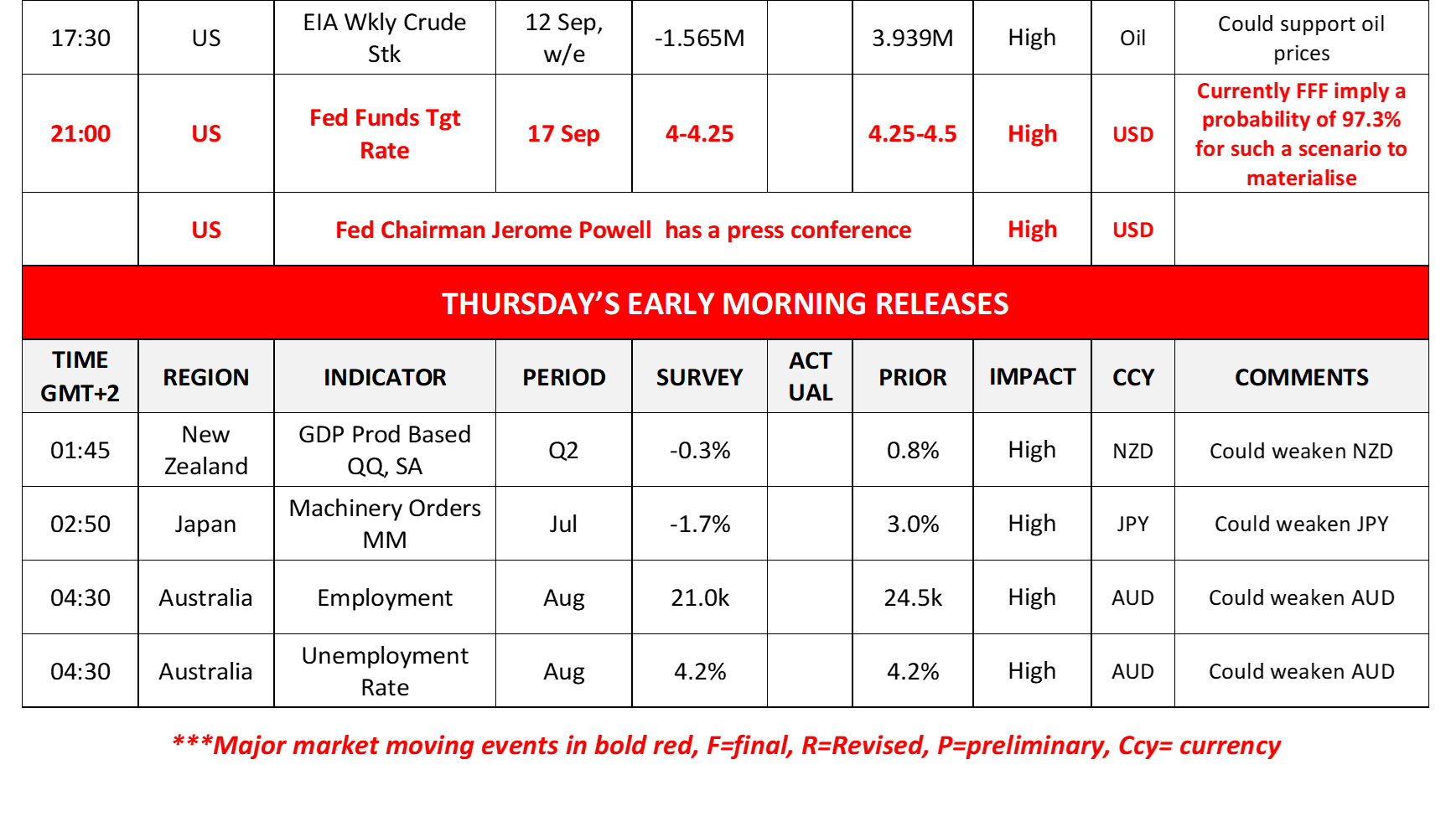 The Fed’s interest rate decision is set to occur today and is set to garner significant market attention. The bank is widely expected to cut rates by 25 basis points and currently Fed Fund Futures (FFF) imply a probability of 97.3% for such a scenario to materialise with the rest implying that a 50 basis points rate cut is also possible. FFF also imply that the bank is expected to deliver another rate cut in its October meeting and a third one in the December meeting. Should the bank today, cut rates as expected, which is also our base scenario, we expect the market’s expectations to shift towards the bank’s forward guidance, which is to be included in the accompanying statement, the bank’s projections, especially the new dot plot as well as Fed Chairman Powell’s press conference later on. Should the bank in its forward guidance signal that it intends to follow the market’s expectations we may see the USD weakening moderately, while should the bank exceed its expectations we may see the greenback tumbling. On the flip side if the forward guidance shows that the bank is more restrained and hesitant to deliver another two rate cuts in October and December, we may see the USD getting asymmetric support as the market’s dovish expectations may ease and the market may be forced to reposition itself.