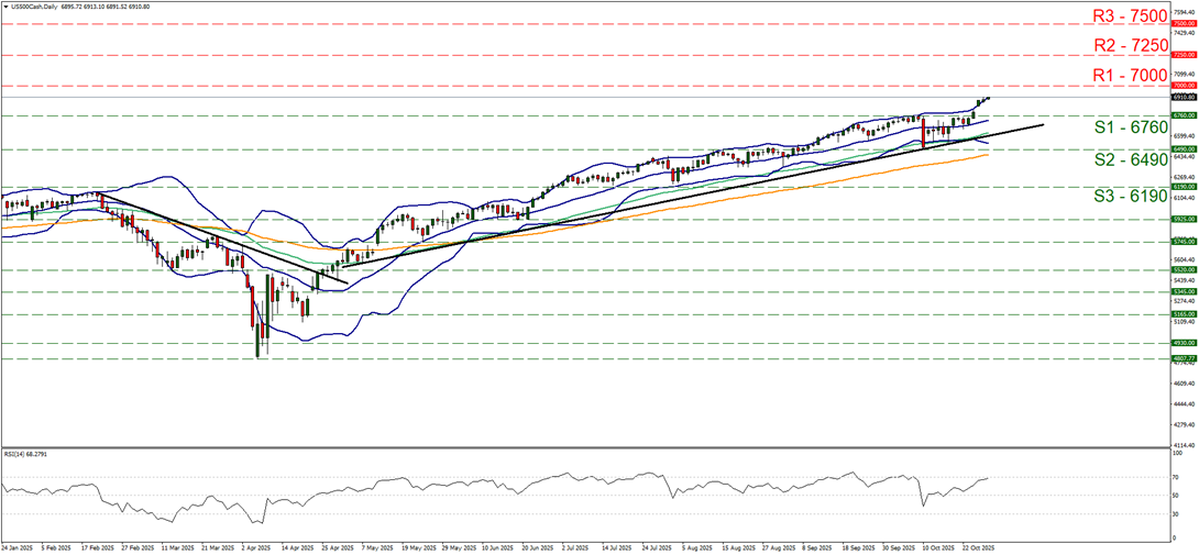 Since our last report S&P 500 continued to rise breaking the 6760 (S1) resistance line which marked an All Time High (ATH) level for the index and turned it to a support line. We maintain our bullish outlook for the index on a technical level and intend to keep it as long as the upward trendline guiding it since early May, remains intact. We also note that the RSI indicator is nearing the reading of 70, implying a strong bullish market sentiment for the index, yet at the same time also signals that the index’s price action is nearing overbought levels and may be ripe for a correction lower. We are getting similar signals by the fact that the price action broke the upper Bollinger band hence along with our bullish outlook we also issue a warning for a possible correction lower of the index, yet as long as the upward trendline remains intact we are to view the possible drop as just that a correction and not a change of trend. For a change of trend and a bearish outlook to emerge we would require the index to break the 6760 (S1) support line and continue lower to also break the prementioned upward trendline in a first signal of an interruption of the upward movement of the index and then to continue even lower to reach if not breach the 6490 (S2) support level. On the flip side, we set as the next possible target for the bulls the 7000 (R1) round figure as the first resistance line and the 7250 (R2) resistance level as the second, yet as the index is moving in unchartered waters and only the next actual peak will be showing the next resistance level.
