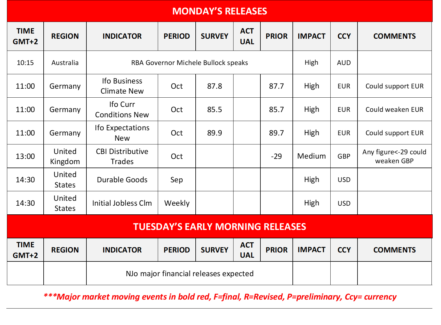 Today we note the speech of RBA’s Governor Michelle Bullock and as for financial releases, Germany’s Ifo indicators for October, UK’s CBI Distributive trades indicator for the same month and from the US the US Durable Goods orders for September and the weekly initial jobless claims.